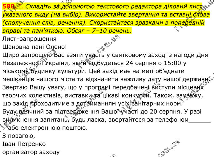 580. І. Складіть за допомогою текстового редактора діловий лист указаного виду (на вибір). Використайте звертання та вставні слова (сполучення слів, речення). Скористайтеся зразками в попередній вправі та пам'яткою. Обсяг – 7–10 речень. Лист–запрошення Шановна пані Олено! Щиро запрошую Вас взяти участь у святковому заході з нагоди Дня Незалежності України, який відбудеться 24 серпня о 15:00 у міському будинку культури. Цей захід має на меті об’єднати мешканців нашого міста та відзначити важливу дату нашої держави. Звертаю Вашу увагу, що у програмі передбачені виступи місцевих творчих колективів, виставки та цікаві конкурси. Також, зауважу, що захід проходитиме з дотриманням усіх санітарних норм. Буду вдячний за підтвердження Вашої участі до 20 серпня. У разі виникнення запитань, будь ласка, звертайтеся за телефоном______ – або електронною поштою. З повагою, Іван Петренко організатор заходу