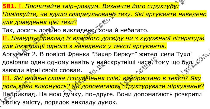 581. І. Прочитайте твір–роздум. Визначте його структуру. Поміркуйте, чи вдало сформульовано тезу. Які аргументи наведено для доведення цієї тези? Так, досить логічно викладено, хоча й небагато. II. Наведіть приклад із власного досвіду чи з художньої літератури для ілюстрації одного з наведених у тексті аргументів. Аргумент 2. В повісті Франка “Захар Беркут” жителі села Тухлі довіряли один одному навіть у найскрутніші часи, тому що булі завжди вірні своїм словам. III. Які вставні слова (сполучення слів) використано в тексті? Яку роль вони виконують? Чи допомагають структурувати міркування? Наприклад, На мою думку, по–друге. Вони допомагають розкрити логіку змісту, порядок викладу думок.