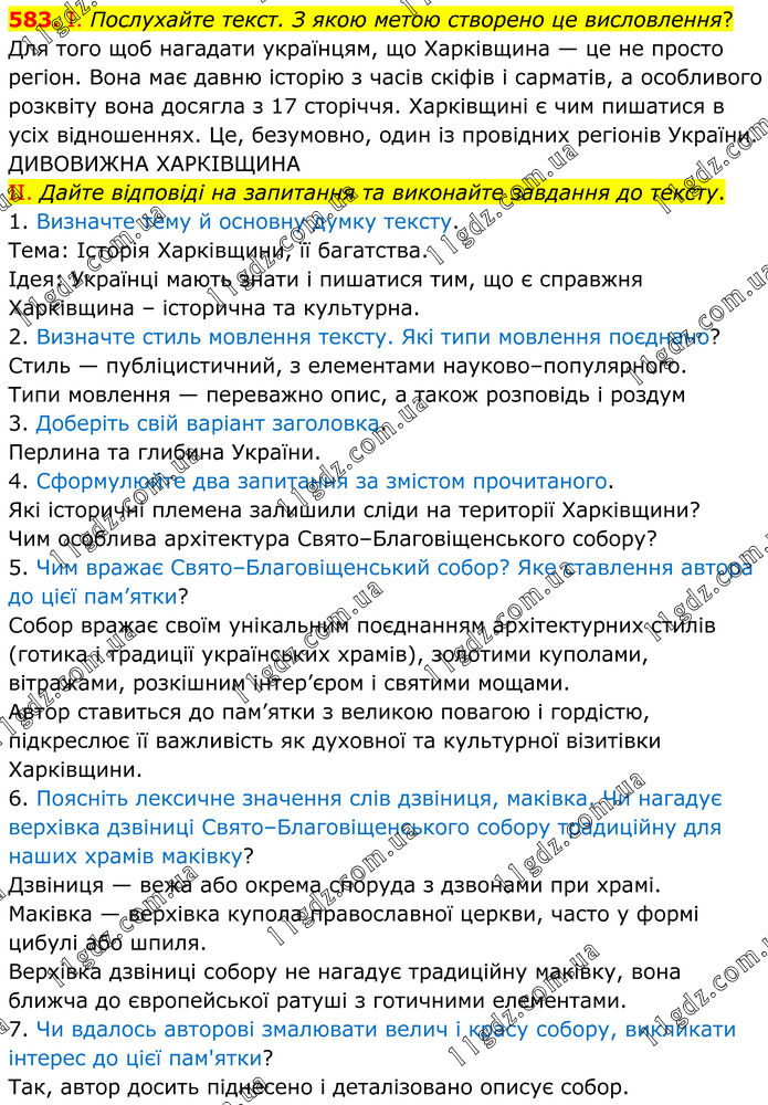 583. І. Послухайте текст. З якою метою створено це висловлення? Для того щоб нагадати українцям, що Харківщина — це не просто регіон. Вона має давню історію з часів скіфів і сарматів, а особливого розквіту вона досягла з 17 сторіччя. Харківщині є чим пишатися в усіх відношеннях. Це, безумовно, один із провідних регіонів України. ДИВОВИЖНА ХАРКІВЩИНА II. Дайте відповіді на запитання та виконайте завдання до тексту. 1. Визначте тему й основну думку тексту. Тема: Історія Харківщини, її багатства. Ідея: Українці мають знати і пишатися тим, що є справжня Харківщина – історична та культурна. 2. Визначте стиль мовлення тексту. Які типи мовлення поєднано? Стиль — публіцистичний, з елементами науково–популярного. Типи мовлення — переважно опис, а також розповідь і роздум 3. Доберіть свій варіант заголовка. Перлина та глибина України. 4. Сформулюйте два запитання за змістом прочитаного. Які історичні племена залишили сліди на території Харківщини? Чим особлива архітектура Свято–Благовіщенського собору? 5. Чим вражає Свято–Благовіщенський собор? Яке ставлення автора до цієї пам’ятки? Собор вражає своїм унікальним поєднанням архітектурних стилів (готика і традиції українських храмів), золотими куполами, вітражами, розкішним інтер’єром і святими мощами. Автор ставиться до пам’ятки з великою повагою і гордістю, підкреслює її важливість як духовної та культурної візитівки Харківщини. 6. Поясніть лексичне значення слів дзвіниця, маківка. Чи нагадує верхівка дзвіниці Свято–Благовіщенського собору традиційну для наших храмів маківку? Дзвіниця — вежа або окрема споруда з дзвонами при храмі. Маківка — верхівка купола православної церкви, часто у формі цибулі або шпиля. Верхівка дзвіниці собору не нагадує традиційну маківку, вона ближча до європейської ратуші з готичними елементами. 7. Чи вдалось авторові змалювати велич і красу собору, викликати інтерес до цієї пам'ятки? Так, автор досить піднесено і деталізовано описує собор.