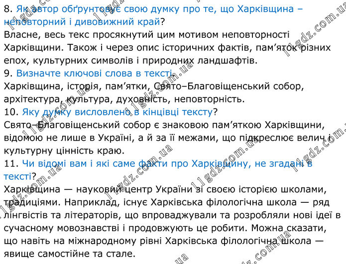8. Як автор обґрунтовує свою думку про те, що Харківщина – неповторний і дивовижний край? Власне, весь текс просякнутий цим мотивом неповторності Харківщини. Також і через опис історичних фактів, пам’яток різних епох, культурних символів і природних ландшафтів. 9. Визначте ключові слова в тексті. Харківщина, історія, пам’ятки, Свято–Благовіщенський собор, архітектура, культура, духовність, неповторність. 10. Яку думку висловлено в кінцівці тексту? Свято–Благовіщенський собор є знаковою пам’яткою Харківщини, відомою не лише в Україні, а й за її межами, що підкреслює велич і культурну цінність краю. 11. Чи відомі вам і які саме факти про Харківщину, не згадані в тексті? Харківщина — науковий центр України зі своєю історією школами, традиціями. Наприклад, існує Харківська філологічна школа — ряд лінгвістів та літераторів, що впроваджували та розробляли нові ідеї в сучасному мовознавстві і продовжують це робити. Можна сказати, що навіть на міжнародному рівні Харківська філологічна школа — явище самостійне та стале.