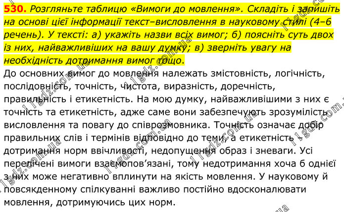 530. Розгляньте таблицю «Вимоги до мовлення». Складіть і запишіть на основі цієї інформації текст–висловлення в науковому стилі (4–6 речень). У тексті: а) укажіть назви всіх вимог; б) поясніть суть двох із них, найважливіших на вашу думку; в) зверніть увагу на необхідність дотримання вимог тощо. До основних вимог до мовлення належать змістовність, логічність, послідовність, точність, чистота, виразність, доречність, правильність і етикетність. На мою думку, найважливішими з них є точність та етикетність, адже саме вони забезпечують зрозумілість висловлення та повагу до співрозмовника. Точність означає добір правильних слів і термінів відповідно до теми, а етикетність – дотримання норм ввічливості, недопущення образ і зневаги. Усі перелічені вимоги взаємопов’язані, тому недотримання хоча б однієї з них може негативно вплинути на якість мовлення. У науковому й повсякденному спілкуванні важливо постійно вдосконалювати мовлення, дотримуючись цих норм.