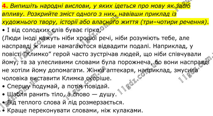 Випишіть народні вислови, у яких ідеться про мову як засіб впливу. Розкрийте зміст одного з них, навівши приклад із художнього твору, історії або власного життя (три–чотири речення). • І від солодких слів буває гірко. (Люди іноді кажуть ніби хрошоі речі, ніби розуміють тебе, але насправді ж лише намагаютося відвадити подалі. Наприклад, у повісті “Климко” герой часто зустрічав людей, що ніби співчували йому, та за улесливими словами була порожнеча, бо вони насправді не хотіли йому допомагати. Жінка аптекаря, наприклад, змусила чоловіка виставити Климка скоріше. • Спершу подумай, а потім повідай. • Шабля ранить тіло, а слово — душу. • Від теплого слова й лід розмерзається. • Краще переконувати словами, ніж кулаками.