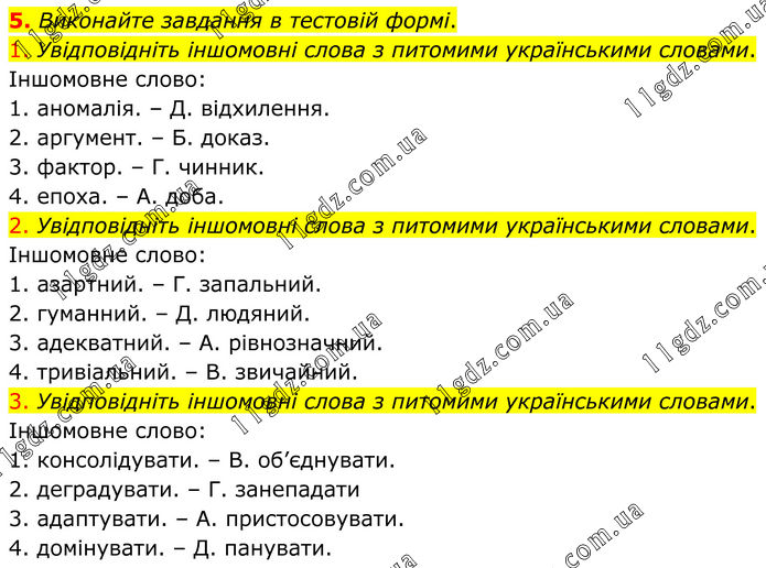 Виконайте завдання в тестовій формі. 1. Увідповідніть іншомовні слова з питомими українськими словами. Іншомовне слово: 1. аномалія. – Д. відхилення. 2. аргумент. – Б. доказ. 3. фактор. – Г. чинник. 4. епоха. – А. доба. 2. Увідповідніть іншомовні слова з питомими українськими словами. Іншомовне слово: 1. азартний. – Г. запальний. 2. гуманний. – Д. людяний. 3. адекватний. – А. рівнозначний. 4. тривіальний. – В. звичайний. 3. Увідповідніть іншомовні слова з питомими українськими словами. Іншомовне слово: 1. консолідувати. – В. об’єднувати. 2. деградувати. – Г. занепадати 3. адаптувати. – А. пристосовувати. 4. домінувати. – Д. панувати.