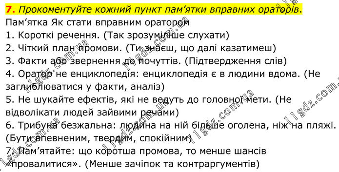 Прокоментуйте кожний пункт пам’ятки вправних ораторів. Пам’ятка Як стати вправним оратором 1. Короткі речення. (Так зрозуміліше слухати) 2. Чіткий план промови. (Ти знаєш, що далі казатимеш) 3. Факти або звернення до почуттів. (Підтвердження слів) 4. Оратор не енциклопедія: енциклопедія є в людини вдома. (Не заглиблюватися у факти, аналіз) 5. Не шукайте ефектів, які не ведуть до головної мети. (Не відволікати людей зайвими речами) 6. Трибуна безжальна: людина на ній більше оголена, ніж на пляжі. (Бути впевненим, твердим, спокійним) 7. Пам’ятайте: що коротша промова, то менше шансів «провалитися». (Менше зачіпок та контраргументів)
