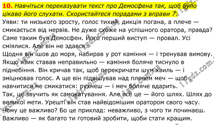 Навчіться переказувати текст про Демосфена так, щоб було цікаво його слухати. Скористайтеся порадами з вправи 7. Уяви: ти низького зросту, голос тихий, дикція погана, а плече — смикається від нервів. Не дуже схоже на успішного оратора, правда? Саме таким був Демосфен. Його перший виступ — провал. Усі сміялися. Але він не здався. Щодня він ішов до моря, набирав у рот каміння — і тренував вимову. Якщо язик ставав неправильно — каміння боляче тиснуло в піднебіння. Він кричав так, щоб перекричати шум хвиль — і зміцнював голос. А ще він підвішував над плечем меч — щоб навчитися не смикатися: рухнеш — і меч боляче вдарить. Так, це звучить як самокатування. Але все це — його шлях. Шлях до великої мети. Урешті він став найвідомішим оратором свого часу. Чому це важливо? Бо це приклад: неважливо, з чого ти починаєш. Важливо — як багато ти готовий зробити, щоби стати кращим.