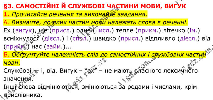 §3. САМОСТІЙНІ Й СЛУЖБОВІ ЧАСТИНИ МОВИ, ВИГУК 1. Прочитайте речення та виконайте завдання. А. Визначте, до яких частин мови належать слова в реченні. Ех (вигук), ще (присл.) одне (числ.) тепле (прикм.) літечко (ім.) всміхнулося (дієсл.) і (спол.) швидко (присл.) відпливло (дієсл.) від (прийм.) нас (займ.)... Б. Обґрунтуйте належність слів до самостійних і службових частин мови. Службові — і, від. Вигук – “ех” – не мають власного лексичного значення. Інші слова відмінюються, змінюються за родами і числами, крім прислівника.