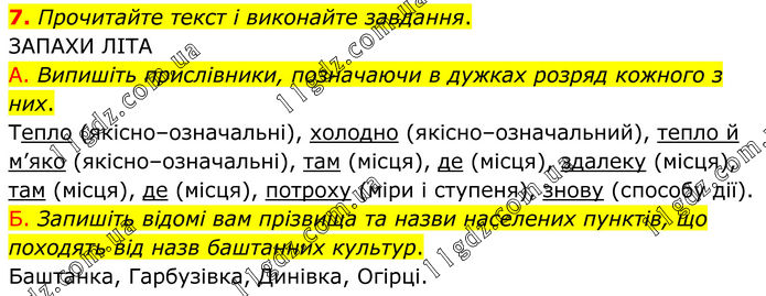 Прочитайте текст і виконайте завдання. ЗАПАХИ ЛІТА А. Випишіть прислівники, позначаючи в дужках розряд кожного з них. Тепло (якісно–означальні), холодно (якісно–означальний), тепло й м’яко (якісно–означальні), там (місця), де (місця), здалеку (місця), там (місця), де (місця), потроху (міри і ступеня), знову (способу дії). Б. Запишіть відомі вам прізвища та назви населених пунктів, що походять від назв баштанних культур. Баштанка, Гарбузівка, Динівка, Огірці.