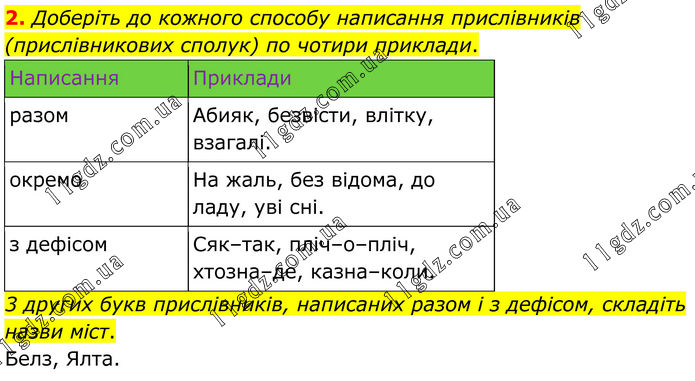 Доберіть до кожного способу написання прислівників (прислівникових сполук) по чотири приклади. Написання Приклади разом Абияк, безвісти, влітку, взагалі. окремо На жаль, без відома, до ладу, уві сні. з дефісом Сяк–так, пліч–о–пліч, хтозна–де, казна–коли. 3 других букв прислівників, написаних разом і з дефісом, складіть назви міст. Белз, Ялта.