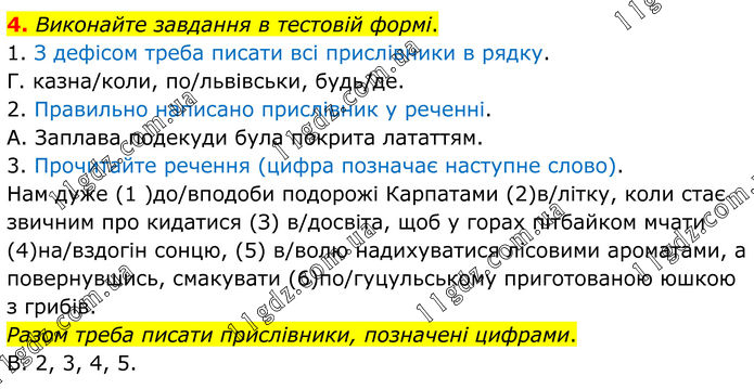 Виконайте завдання в тестовій формі. 1. З дефісом треба писати всі прислівники в рядку. Г. казна/коли, по/львівськи, будь/де. 2. Правильно написано прислівник у реченні. А. Заплава подекуди була покрита лататтям. 3. Прочитайте речення (цифра позначає наступне слово). Нам дуже (1 )до/вподоби подорожі Карпатами (2)в/літку, коли стає звичним про кидатися (З) в/досвіта, щоб у горах пітбайком мчати (4)на/вздогін сонцю, (5) в/волю надихуватися лісовими ароматами, а повернувшись, смакувати (6)по/гуцульському приготованою юшкою з грибів. Разом треба писати прислівники, позначені цифрами. В. 2, 3, 4, 5.