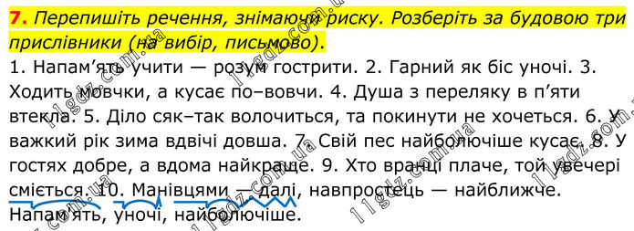 Перепишіть речення, знімаючи риску. Розберіть за будовою три прислівники (на вибір, письмово). 1. Напам’ять учити — розум гострити. 2. Гарний як біс уночі. 3. Ходить мовчки, а кусає по–вовчи. 4. Душа з переляку в п’яти втекла. 5. Діло сяк–так волочиться, та покинути не хочеться. 6. У важкий рік зима вдвічі довша. 7. Свій пес найболючіше кусає. 8. У гостях добре, а вдома найкраще. 9. Хто вранці плаче, той увечері сміється. 10. Манівцями — далі, навпростець — найближче. Напам'ять, уночі, найболючіше.