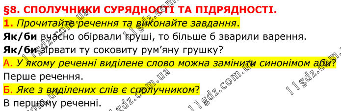 §8. СПОЛУЧНИКИ СУРЯДНОСТІ ТА ПІДРЯДНОСТІ. 1. Прочитайте речення та виконайте завдання. Як/би вчасно обірвали груші, то більше б зварили варення. Як/би зірвати ту соковиту рум’яну грушку? А. У якому реченні виділене слово можна замінити синонімом аби? Перше речення. Б. Яке з виділених слів є сполучником? В першому реченні.