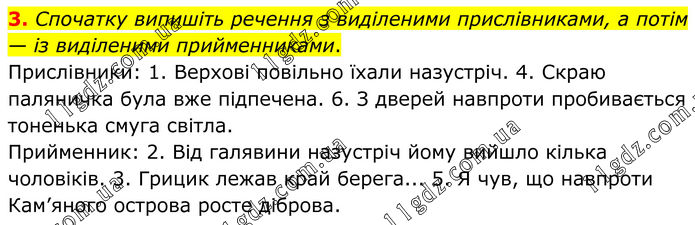 Спочатку випишіть речення з виділеними прислівниками, а потім — із виділеними прийменниками. Прислівники: 1. Верхові повільно їхали назустріч. 4. Скраю паляничка була вже підпечена. 6. З дверей навпроти пробивається тоненька смуга світла. Прийменник: 2. Від галявини назустріч йому вийшло кілька чоловіків. 3. Грицик лежав край берега... 5. Я чув, що навпроти Кам’яного острова росте діброва.