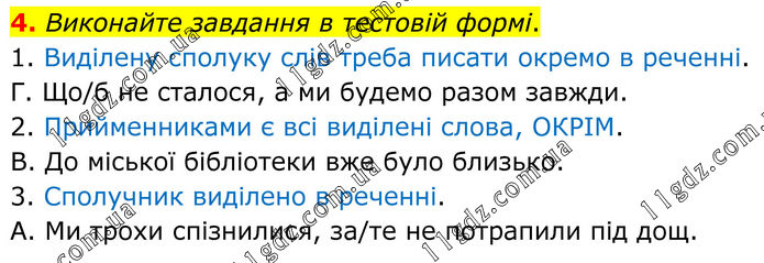 Виконайте завдання в тестовій формі. 1. Виділену сполуку слів треба писати окремо в реченні. Г. Що/б не сталося, а ми будемо разом завжди. 2. Прийменниками є всі виділені слова, ОКРІМ. В. До міської бібліотеки вже було близько. 3. Сполучник виділено в реченні. А. Ми трохи спізнилися, за/те не потрапили під дощ.