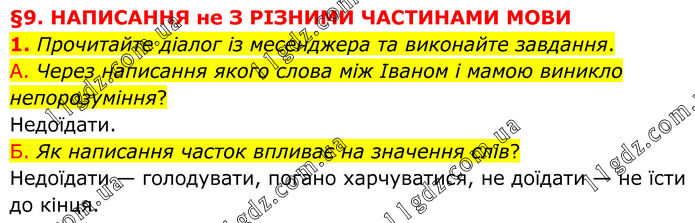 §9. НАПИСАННЯ не З РІЗНИМИ ЧАСТИНАМИ МОВИ 1. Прочитайте діалог із месенджера та виконайте завдання. А. Через написання якого слова між Іваном і мамою виникло непорозуміння? Недоїдати. Б. Як написання часток впливає на значення слів? Недоїдати — голодувати, погано харчуватися, не доїдати — не їсти до кінця.