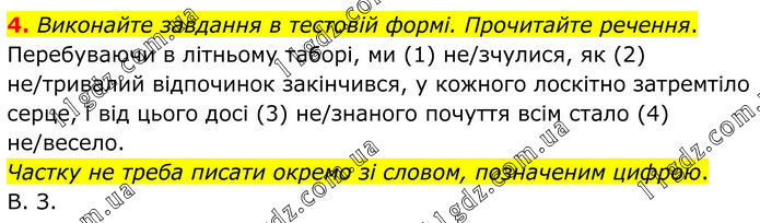 4. Виконайте завдання в тестовій формі. Прочитайте речення. Перебуваючи в літньому таборі, ми (1) не/зчулися, як (2) не/тривалий відпочинок закінчився, у кожного лоскітно затремтіло серце, і від цього досі (3) не/знаного почуття всім стало (4) не/весело. Частку не треба писати окремо зі словом, позначеним цифрою. В. З.