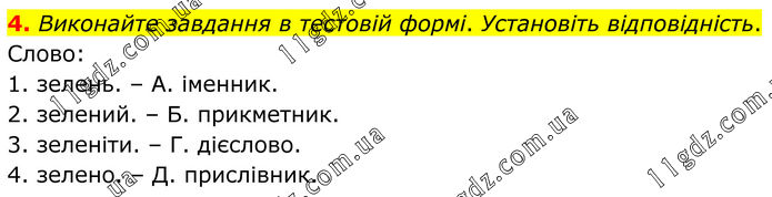 Виконайте завдання в тестовій формі. Установіть відповідність. Слово: 1. зелень. – А. іменник. 2. зелений. – Б. прикметник. 3. зеленіти. – Г. дієслово. 4. зелено. – Д. прислівник.
