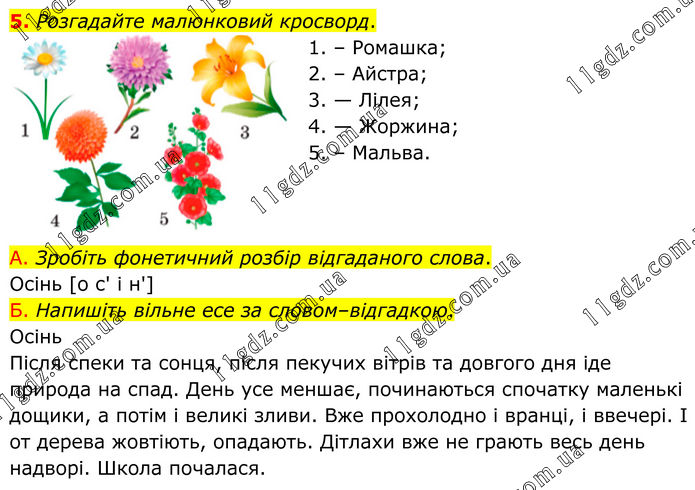 Розгадайте малюнковий кросворд. 1. – Ромашка; 2. – Айстра; 3. — Лілея; 4. — Жоржина; 5. – Мальва. А. Зробіть фонетичний розбір відгаданого слова. Осінь [о с' і н'] Б. Напишіть вільне есе за словом–відгадкою. Осінь Після спеки та сонця, після пекучих вітрів та довгого дня іде природа на спад. День усе меншає, починаються спочатку маленькі дощики, а потім і великі зливи. Вже прохолодно і вранці, і ввечері. І от дерева жовтіють, опадають. Дітлахи вже не грають весь день надворі. Школа почалася.