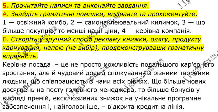 5. Прочитайте написи та виконайте завдання. А. Знайдіть граматичні помилки, вигіравте та прокоментуйте. 1 — освіжний комбо, 2 — самонаклеювальний килимок, 3 — що більше покупців, то менші наші ціни, 4 — керівна компанія. Б. Створіть у зручний спосіб рекламу книжки, одягу, продукту харчування, напою (на вибір), продемонструвавши граматичну вправність. Керівна посада – це не просто можливість подальшого кар'єрного зростання, але й чудовий досвід спілкування з різними творчими людьми, що співпрацюють із нами всіх рівнях. Що більше нових досягнень на посту головного менеджера, то більше бонусів у вигляді премій, ексклюзивних знижок на унікальне програмне забезпечення і, найголовніше, – відкрита кредитна лінія.
