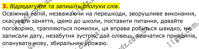 Відредагуйте та запишіть сполуки слів. Освіжний напій, незважаючи на перешкоди, зворушливе виконання, скасувати заняття, ідемо до школи, поставити питання, давайте поговорімо, трапляються помилки, ця вправа робиться швидко, ми записали дату, незабутня зустріч, дай олівець, навчатися принципів, опанувати мову, збиральник урожаю.