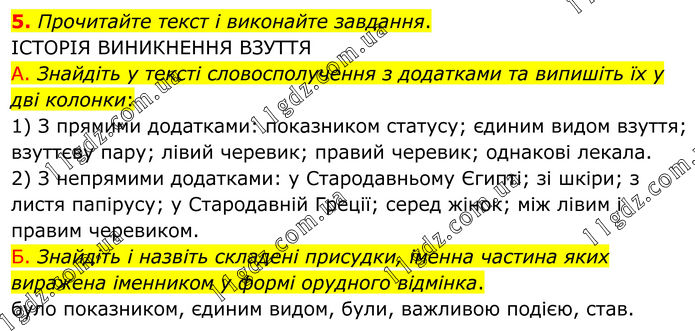 5. Прочитайте текст і виконайте завдання. ІСТОРІЯ ВИНИКНЕННЯ ВЗУТТЯ А. Знайдіть у тексті словосполучення з додатками та випишіть їх у дві колонки: 1) З прямими додатками: показником статусу; єдиним видом взуття; взуттєву пару; лівий черевик; правий черевик; однакові лекала. 2) З непрямими додатками: у Стародавньому Єгипті; зі шкіри; з листя папірусу; у Стародавній Греції; серед жінок; між лівим і правим черевиком. Б. Знайдіть і назвіть складені присудки, іменна частина яких виражена іменником у формі орудного відмінка. було показником, єдиним видом, були, важливою подією, став.