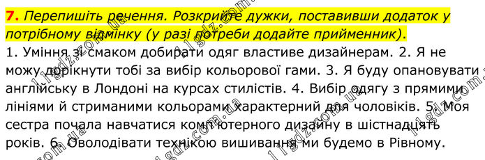 7. Перепишіть речення. Розкрийте дужки, поставивши додаток у потрібному відмінку (у разі потреби додайте прийменник). 1. Уміння зі смаком добирати одяг властиве дизайнерам. 2. Я не можу дорікнути тобі за вибір кольорової гами. 3. Я буду опановувати англійську в Лондоні на курсах стилістів. 4. Вибір одягу з прямими лініями й стриманими кольорами характерний для чоловіків. 5. Моя сестра почала навчатися комп’ютерного дизайну в шістнадцять років. 6. Оволодівати технікою вишивання ми будемо в Рівному.