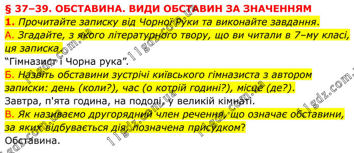 § 37–39. ОБСТАВИНА. ВИДИ ОБСТАВИН ЗА ЗНАЧЕННЯМ 1. Прочитайте записку від Чорної Руки та виконайте завдання. A. Згадайте, з якого літературного твору, що ви читали в 7–му класі, ця записка. “Гімназист і Чорна рука”. Б. Назвіть обставини зустрічі київського гімназиста з автором записки: день (коли?), час (о котрій годині?), місце (де?). Завтра, п'ята година, на подолі, у великій кімнаті. B. Як називаємо другорядний член речення, що означає обставини, за яких відбувається дія, позначена присудком? Обставина.