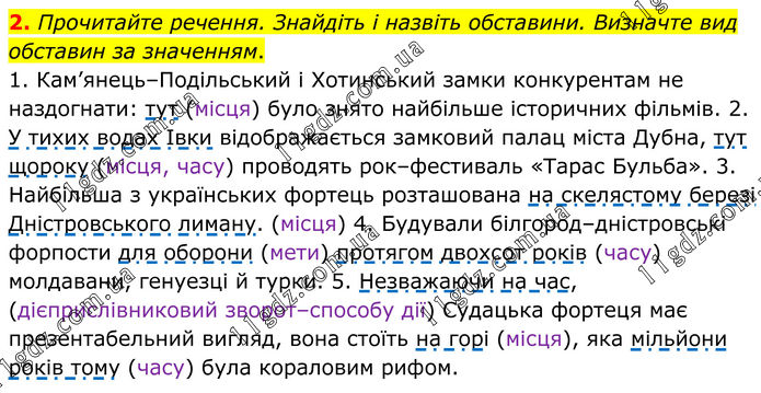 2. Прочитайте речення. Знайдіть і назвіть обставини. Визначте вид обставин за значенням. 1. Кам’янець–Подільський і Хотинський замки конкурентам не наздогнати: тут (місця) було знято найбільше історичних фільмів. 2. У тихих водах Івки відображається замковий палац міста Дубна, тут щороку (місця, часу) проводять рок–фестиваль «Тарас Бульба». 3. Найбільша з українських фортець розташована на скелястому березі Дністровського лиману. (місця) 4. Будували білгород–дністровські форпости для оборони (мети) протягом двохсот років (часу) молдавани, генуезці й турки. 5. Незважаючи на час, (дієприслівниковий зворот–способу дії) Судацька фортеця має презентабельний вигляд, вона стоїть на горі (місця), яка мільйони років тому (часу) була кораловим рифом.