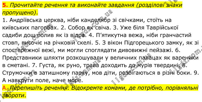 5. Прочитайте речення та виконайте завдання (розділові знаки пропущено). 1. Андріївська церква, ніби канделябр зі свічками, стоїть на київських пагорбах. 2. Собор як свіча. 3. Уже біля Таврійської садиби дощ полив як із відра. 4. П’ятикутна вежа, ніби гранчастий стовп, височіє на річковій скелі. 5. З вікон Підгорецького замку, як зі спостережної вежі, ми могли споглядати дивовижні пейзажі. 6. Представники шляхти розкошували у величних палацах як вареники в сметані. 7. Густа, як руно, трава доходить до мурів твердині. 8. Струмочки в затишному парку, мов діти, розбігаються в різні боки. 9. А навкруги поле, наче море. А. Перепишіть речення. Відокремте комами, де потрібно, порівняльні звороти.