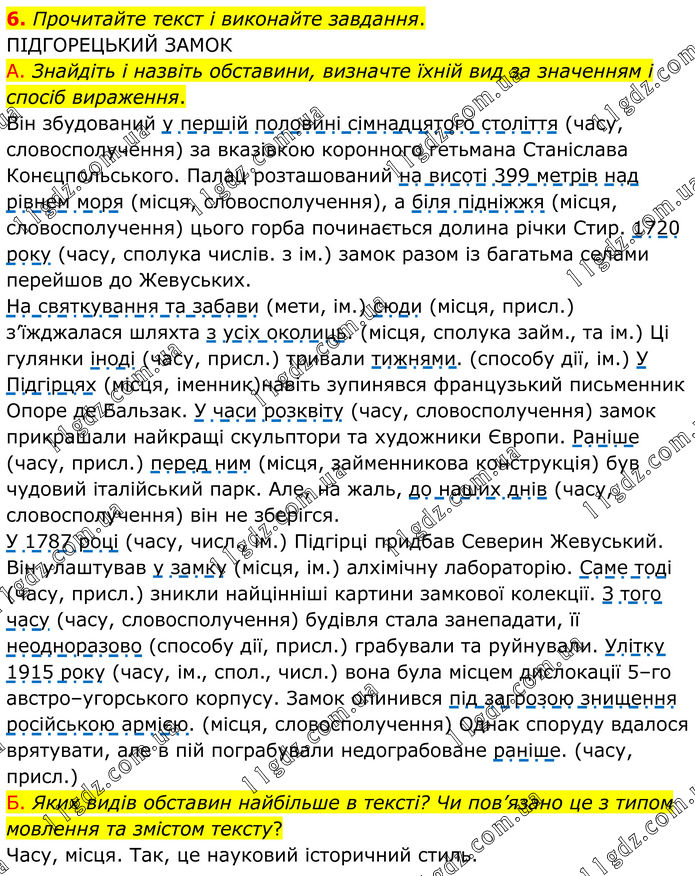 6. Прочитайте текст і виконайте завдання. ПІДГОРЕЦЬКИЙ ЗАМОК А. Знайдіть і назвіть обставини, визначте їхній вид за значенням і спосіб вираження. Він збудований у першій половині сімнадцятого століття (часу, словосполучення) за вказівкою коронного гетьмана Станіслава Конєцпольського. Палац розташований на висоті 399 метрів над рівнем моря (місця, словосполучення), а біля підніжжя (місця, словосполучення) цього горба починається долина річки Стир. 1720 року (часу, сполука числів. з ім.) замок разом із багатьма селами перейшов до Жевуських. На святкування та забави (мети, ім.) сюди (місця, присл.) з’їжджалася шляхта з усіх околиць. (місця, сполука займ., та ім.) Ці гулянки іноді (часу, присл.) тривали тижнями. (способу дії, ім.) У Підгірцях (місця, іменник)навіть зупинявся французький письменник Опоре де Бальзак. У часи розквіту (часу, словосполучення) замок прикрашали найкращі скульптори та художники Європи. Раніше (часу, присл.) перед ним (місця, займенникова конструкція) був чудовий італійський парк. Але, на жаль, до наших днів (часу, словосполучення) він не зберігся. У 1787 році (часу, числ., ім.) Підгірці придбав Северин Жевуський. Він улаштував у замку (місця, ім.) алхімічну лабораторію. Саме тоді (часу, присл.) зникли найцінніші картини замкової колекції. З того часу (часу, словосполучення) будівля стала занепадати, її неодноразово (способу дії, присл.) грабували та руйнували. Улітку 1915 року (часу, ім., спол., числ.) вона була місцем дислокації 5–го австро–угорського корпусу. Замок опинився під загрозою знищення російською армією. (місця, словосполучення) Однак споруду вдалося врятувати, але в пій пограбували недограбоване раніше. (часу, присл.) Б. Яких видів обставин найбільше в тексті? Чи пов’язано це з типом мовлення та змістом тексту? Часу, місця. Так, це науковий історичний стиль.