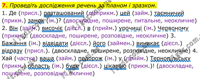 7. Проведіть дослідження речень за планом і зразком. 1. Де (присл.) розташований (дієприкм.) цей (займ.) таємничий (прикм.) замок (ім.)? (двоскладне, поширене, питальне, неокличне) 2. Він (займ.) височіє (дієсл.) в (прийм.) урочищі (ім.) Червоному (прикм.). (двоскладне, поширене, розповідне, неокличне) 3. Бажання (ім.) відвідати (дієсл.) його (займен.) виникає (дієсл.) відразу (присл.). (двоскладне, поширене, розповідне, неокличне) 4. Хай (частка) ваша (займ.) подорож (ім.) у (прийм.) Тернопільську (прикм.) область (ім.) буде (дієсл.) цікавою (прикм.)! (двоскладне, поширене, розповідне, окличне)