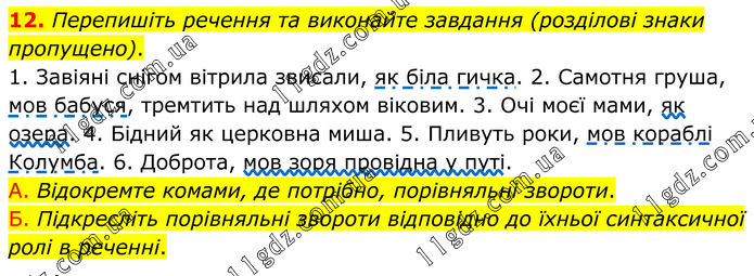 12. Перепишіть речення та виконайте завдання (розділові знаки пропущено). 1. Завіяні снігом вітрила звисали, як біла гичка. 2. Самотня груша, мов бабуся, тремтить над шляхом віковим. 3. Очі моєї мами, як озера. 4. Бідний як церковна миша. 5. Пливуть роки, мов кораблі Колумба. 6. Доброта, мов зоря провідна у путі. А. Відокремте комами, де потрібно, порівняльні звороти. Б. Підкресліть порівняльні звороти відповідно до їхньої синтаксичної ролі в реченні.
