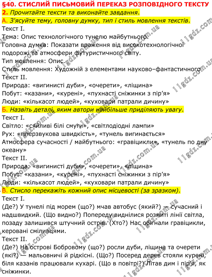 §40. СТИСЛИЙ ПИСЬМОВИЙ ПЕРЕКАЗ РОЗПОВІДНОГО ТЕКСТУ 2. Прочитайте тексти та виконайте завдання. А. З'ясуйте тему, головну думку, тип і стиль мовлення текстів. Текст I. Тема: Опис технологічного тунелю майбутнього. Головна думка: Показати враження від високотехнологічної подорожі та атмосфери футуристичного світу. Тип мовлення: Опис. Стиль мовлення: Художній з елементами науково–фантастичного Текст II. Природа: «вигинисті дуби», «очерети», «ліщина» Побут: «казани», «курені», «пухнасті сніжинки з пір’я» Люди: «кількасот людей», «куховари патрали дичину» Б. Назвіть деталі, яким автори найбільше приділяють увагу. Текст I. Світло: «сяйливі білі смуги», «світлодіодні лампи» Рух: «гіперзвукова швидкість», «тунель вигинається» Атмосфера сучасності / майбутнього: «гравіцикли», «тунель по дну океану» Текст II. Природа: «вигинисті дуби», «очерети», «ліщина» Побут: «казани», «курені», «пухнасті сніжинки з пір’я» Люди: «кількасот людей», «куховари патрали дичину» В. Стисло перекажіть кожний опис місцевості (за зразком). Текст I. (Де?) У тунелі під морем (що?) мчав автобус (який?) — сучасний і надшвидкий. (Що видно?) Попереду виднілися розмиті лінії світла, позаду залишився штучний острів. (Хто?) Нас обігнали гравіцикли, керовані сміливцями. Текст II. (Де?) На острові Бобровому (що?) росли дуби, ліщина та очерети (які?) — мальовничі й рідкісні. (Що?) Посеред дерев стояли курені, біля казанів працювали кухарі. (Що в повітрі?) Літав дим і пір’я, як сніжинки.