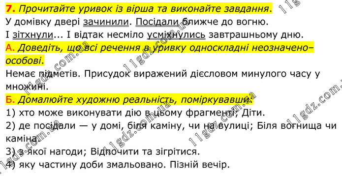 Прочитайте уривок із вірша та виконайте завдання. У домівку двері зачинили. Посідали ближче до вогню. І зітхнули... І відтак несміло усміхнулись завтрашньому дню. А. Доведіть, що всі речення в уривку односкладні неозначено–особові. Немає підметів. Присудок виражений дієсловом минулого часу у множині. Б. Домалюйте художню реальність, поміркувавши: 1) хто може виконувати дію в цьому фрагменті; Діти. 2) де посідали — у домі, біля каміну, чи на вулиці; Біля вогнища чи каміна. 3) з якої нагоди; Відпочити та зігрітися. 4) яку частину доби змальовано. Пізній вечір.