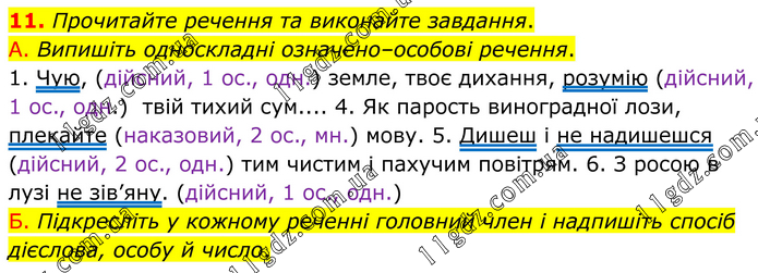 Прочитайте речення та виконайте завдання. А. Випишіть односкладні означено–особові речення. 1. Чую, (дійсний, 1 ос., одн.) земле, твоє дихання, розумію (дійсний, 1 ос., одн.) твій тихий сум.... 4. Як парость виноградної лози, плекайте (наказовий, 2 ос., мн.) мову. 5. Дишеш і не надишешся (дійсний, 2 ос., одн.) тим чистим і пахучим повітрям. 6. З росою в лузі не зів’яну. (дійсний, 1 ос., одн.) Б. Підкресліть у кожному реченні головний член і надпишіть спосіб дієслова, особу й число.
