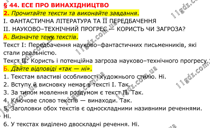 § 44. ЕСЕ ПРО ВИНАХІДНИЦТВО 2. Прочитайте тексти та виконайте завдання. І. ФАНТАСТИЧНА ЛІТЕРАТУРА ТА ЇЇ ПЕРЕДБАЧЕННЯ II. НАУКОВО–ТЕХНІЧНИЙ ПРОГРЕС — КОРИСТЬ ЧИ ЗАГРОЗА? А. Визначте тему текстів. Текст І: Передбачення науково–фантастичних письменників, які стали реальністю. Текст ІІ: Користь і потенційна загроза науково–технічного прогресу. Б. Дайте відповіді «так — ні». 1. Текстам властиві особливості художнього стилю. Ні. 2. Вступу й висновку немає в тексті І. Так. 3. За типом мовлення роздумом є текст II. Так. 4. Ключове слово текстів — винаходи. Так. 5. Заголовки обох текстів є односкладними називними реченнями. Ні. 6. У текстах виділено двоскладні речення. Ні.