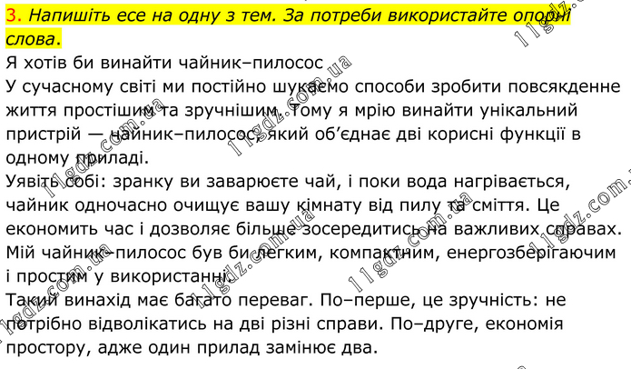 3. Напишіть есе на одну з тем. За потреби використайте опорні слова. Я хотів би винайти чайник–пилосос У сучасному світі ми постійно шукаємо способи зробити повсякденне життя простішим та зручнішим. Тому я мрію винайти унікальний пристрій — чайник–пилосос, який об’єднає дві корисні функції в одному приладі. Уявіть собі: зранку ви заварюєте чай, і поки вода нагрівається, чайник одночасно очищує вашу кімнату від пилу та сміття. Це економить час і дозволяє більше зосередитись на важливих справах. Мій чайник–пилосос був би легким, компактним, енергозберігаючим і простим у використанні. Такий винахід має багато переваг. По–перше, це зручність: не потрібно відволікатись на дві різні справи. По–друге, економія простору, адже один прилад замінює два.