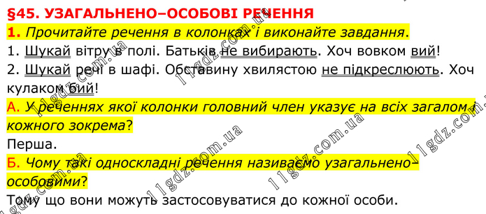 §45. УЗАГАЛЬНЕНО–ОСОБОВІ РЕЧЕННЯ 1. Прочитайте речення в колонках і виконайте завдання. 1. Шукай вітру в полі. Батьків не вибирають. Хоч вовком вий! 2. Шукай речі в шафі. Обставину хвилястою не підкреслюють. Хоч кулаком бий! А. У реченнях якої колонки головний член указує на всіх загалом і кожного зокрема? Перша. Б. Чому такі односкладні речення називаємо узагальнено–особовими? Тому що вони можуть застосовуватися до кожної особи.