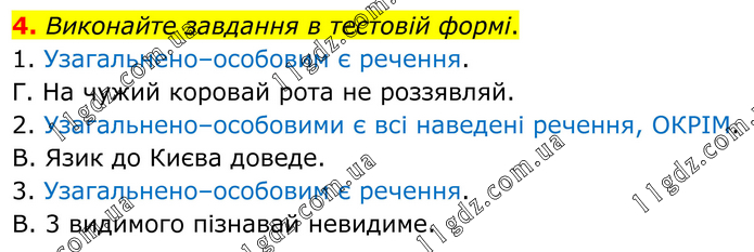 Виконайте завдання в тестовій формі. 1. Узагальнено–особовим є речення. Г. На чужий коровай рота не роззявляй. 2. Узагальнено–особовими є всі наведені речення, ОКРІМ. В. Язик до Києва доведе. 3. Узагальнено–особовим є речення. В. 3 видимого пізнавай невидиме.