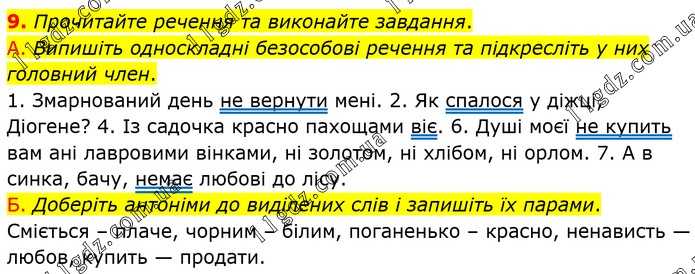 Прочитайте речення та виконайте завдання. А. Випишіть односкладні безособові речення та підкресліть у них головний член. 1. Змарнований день не вернути мені. 2. Як спалося у діжці, Діогене? 4. Із садочка красно пахощами віє. 6. Душі моєї не купить вам ані лавровими вінками, ні золотом, ні хлібом, ні орлом. 7. А в синка, бачу, немає любові до лісу. Б. Доберіть антоніми до виділених слів і запишіть їх парами. Сміється – плаче, чорним – білим, поганенько – красно, ненависть — любов, купить — продати.