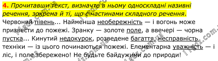 4. Прочитавши текст, визначте в ньому односкладні називні речення, зокрема й ті, що є частинами складного речення. Червоний півень... Найменша необережність — і вогонь може призвести до пожежі. Зранку — золоте поле, а ввечері — чорна пустка... Кинутий недокурок, розведене багаття, несправність техніки — із цього починаються пожежі. Елементарна уважність — і ліс, і поле збережено! Не будьте байдужими до природи!