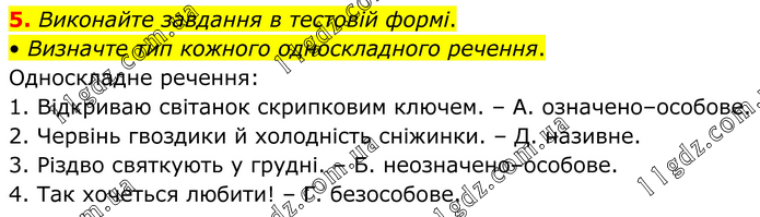 5. Виконайте завдання в тестовій формі. • Визначте тип кожного односкладного речення. Односкладне речення: 1. Відкриваю світанок скрипковим ключем. – А. означено–особове. 2. Червінь гвоздики й холодність сніжинки. – Д. називне. 3. Різдво святкують у грудні. – Б. неозначено–особове. 4. Так хочеться любити! – Г. безособове.