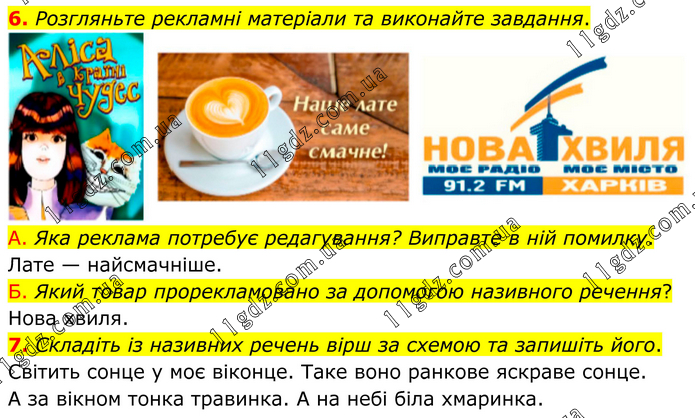 6. Розгляньте рекламні матеріали та виконайте завдання. А. Яка реклама потребує редагування? Виправте в ній помилку. Лате — найсмачніше. Б. Який товар прорекламовано за допомогою називного речення? Нова хвиля. 7. Складіть із називних речень вірш за схемою та запишіть його. Світить сонце у моє віконце. Таке воно ранкове яскраве сонце. А за вікном тонка травинка. А на небі біла хмаринка.