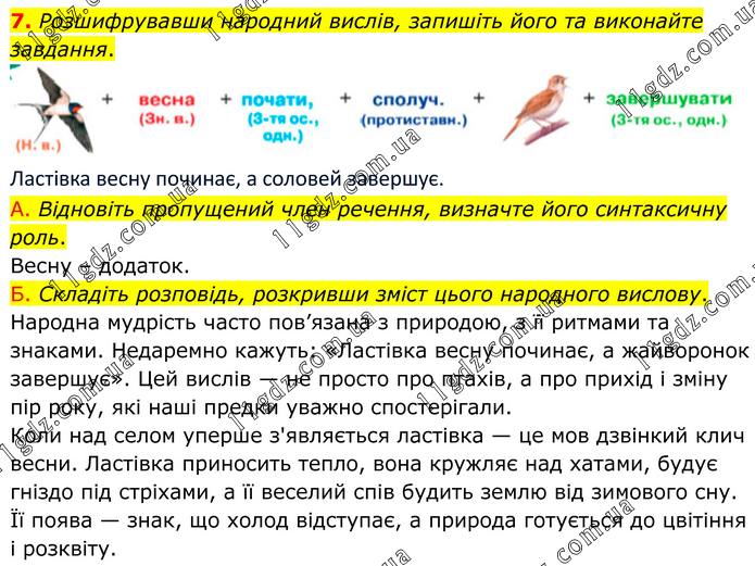 Розшифрувавши народний вислів, запишіть його та виконайте завдання. Ластівка весну починає, а соловей завершує. А. Відновіть пропущений член речення, визначте його синтаксичну роль. Весну – додаток. Б. Складіть розповідь, розкривши зміст цього народного вислову. Народна мудрість часто пов’язана з природою, з її ритмами та знаками. Недаремно кажуть: «Ластівка весну починає, а жайворонок завершує». Цей вислів — не просто про птахів, а про прихід і зміну пір року, які наші предки уважно спостерігали. Коли над селом уперше з'являється ластівка — це мов дзвінкий клич весни. Ластівка приносить тепло, вона кружляє над хатами, будує гніздо під стріхами, а її веселий спів будить землю від зимового сну. Її поява — знак, що холод відступає, а природа готується до цвітіння і розквіту.
