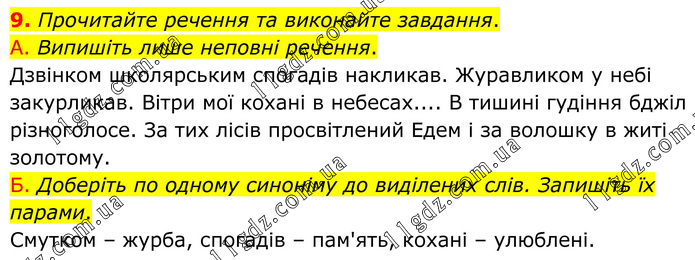 Прочитайте речення та виконайте завдання. А. Випишіть лише неповні речення. Дзвінком школярським спогадів накликав. Журавликом у небі закурликав. Вітри мої кохані в небесах.... В тишині гудіння бджіл різноголосе. За тих лісів просвітлений Едем і за волошку в житі золотому. Б. Доберіть по одному синоніму до виділених слів. Запишіть їх парами. Смутком – журба, спогадів – пам'ять, кохані – улюблені.