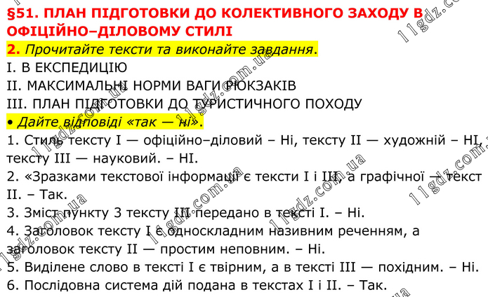 §51. ПЛАН ПІДГОТОВКИ ДО КОЛЕКТИВНОГО ЗАХОДУ В ОФІЦІЙНО–ДІЛОВОМУ СТИЛІ 2. Прочитайте тексти та виконайте завдання. I. В ЕКСПЕДИЦІЮ II. МАКСИМАЛЬНІ НОРМИ ВАГИ РЮКЗАКІВ III. ПЛАН ПІДГОТОВКИ ДО ТУРИСТИЧНОГО ПОХОДУ • Дайте відповіді «так — ні». 1. Стиль тексту І — офіційно–діловий – Ні, тексту II — художній – НІ, тексту III — науковий. – НІ. 2. «Зразками текстової інформації є тексти І і III, а графічної — текст II. – Так. 3. Зміст пункту 3 тексту III передано в тексті І. – Ні. 4. Заголовок тексту І є односкладним називним реченням, а заголовок тексту II — простим неповним. – Ні. 5. Виділене слово в тексті І є твірним, а в тексті III — похідним. – Ні. 6. Послідовна система дій подана в текстах І і II. – Так.