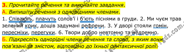 Прочитайте речення та виконайте завдання. А. Випишіть речення з однорідними членами. 1. Співають, плачуть солов’ї і б’ють піснями в груди. 2. Ми чуєм трав зелений крик, дощів задумані рефрени. 3. У дворі стояли гомін, пересміхи, перегуки. 6. Твори добро невтомно та недремно. Б. Підкресліть однорідні члени речення та слово, з яким вони пов’язані за змістом, відповідно до їхньої синтаксичної ролі.