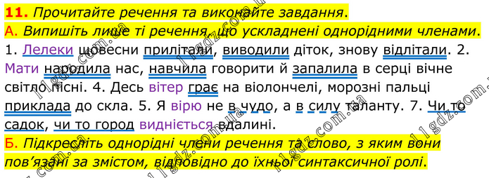 Прочитайте речення та виконайте завдання. А. Випишіть лише ті речення, що ускладнені однорідними членами. 1. Лелеки щовесни прилітали, виводили діток, знову відлітали. 2. Мати народила нас, навчила говорити й запалила в серці вічне світло пісні. 4. Десь вітер грає на віолончелі, морозні пальці приклада до скла. 5. Я вірю не в чудо, а в силу таланту. 7. Чи то садок, чи то город видніється вдалині. Б. Підкресліть однорідні члени речення та слово, з яким вони пов’язані за змістом, відповідно до їхньої синтаксичної ролі.