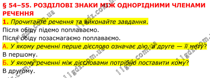 § 54–55. РОЗДІЛОВІ ЗНАКИ МІЖ ОДНОРІДНИМИ ЧЛЕНАМИ РЕЧЕННЯ 1. Прочитайте речення та виконайте завдання. Після обіду підемо поплаваємо. Після обіду позасмагаємо поплаваємо. А. У якому реченні перше дієслово означає дію, а друге — її мету? В першому. Б. У якому реченні між дієсловами потрібно поставити кому? В другому.
