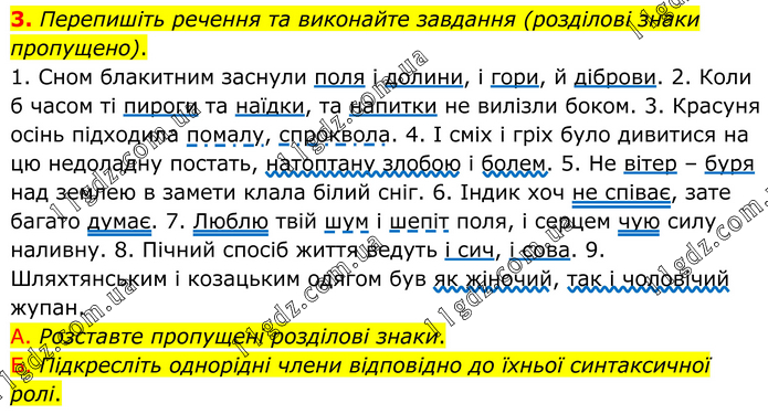 Перепишіть речення та виконайте завдання (розділові знаки пропущено). 1. Сном блакитним заснули поля і долини, і гори, й діброви. 2. Коли б часом ті пироги та наїдки, та напитки не вилізли боком. 3. Красуня осінь підходила помалу, спроквола. 4. І сміх і гріх було дивитися на цю недоладну постать, натоптану злобою і болем. 5. Не вітер – буря над землею в замети клала білий сніг. 6. Індик хоч не співає, зате багато думає. 7. Люблю твій шум і шепіт поля, і серцем чую силу наливну. 8. Пічний спосіб життя ведуть і сич, і сова. 9. Шляхтянським і козацьким одягом був як жіночий, так і чоловічий жупан. А. Розставте пропущені розділові знаки. Б. Підкресліть однорідні члени відповідно до їхньої синтаксичної ролі.
