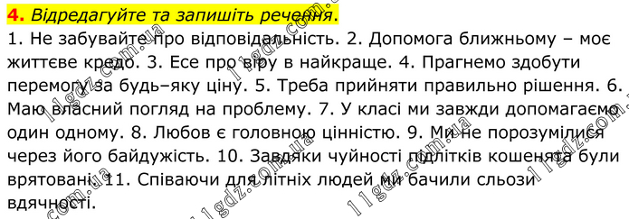 Відредагуйте та запишіть речення. 1. Не забувайте про відповідальність. 2. Допомога ближньому – моє життєве кредо. 3. Есе про віру в найкраще. 4. Прагнемо здобути перемогу за будь–яку ціну. 5. Треба прийняти правильно рішення. 6. Маю власний погляд на проблему. 7. У класі ми завжди допомагаємо один одному. 8. Любов є головною цінністю. 9. Ми не порозумілися через його байдужість. 10. Завдяки чуйності підлітків кошенята були врятовані. 11. Співаючи для літніх людей ми бачили сльози вдячності.